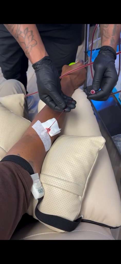 Once the session begins, a medical professional will gently place an IV line into a vein in your arm to start the process. Your blood is then drawn through the IV line, passed through a special medical-grade filtration system, and returned to your body via another vein in your other arm.